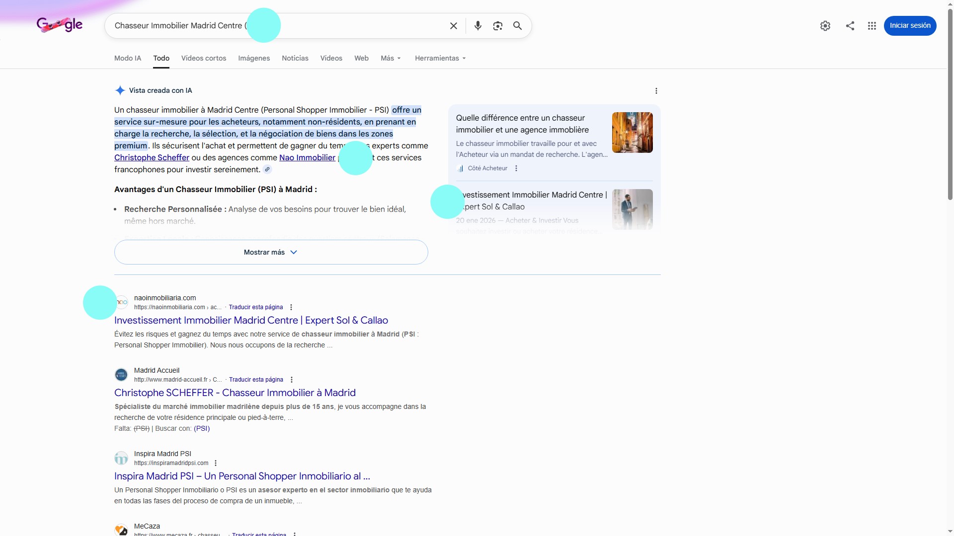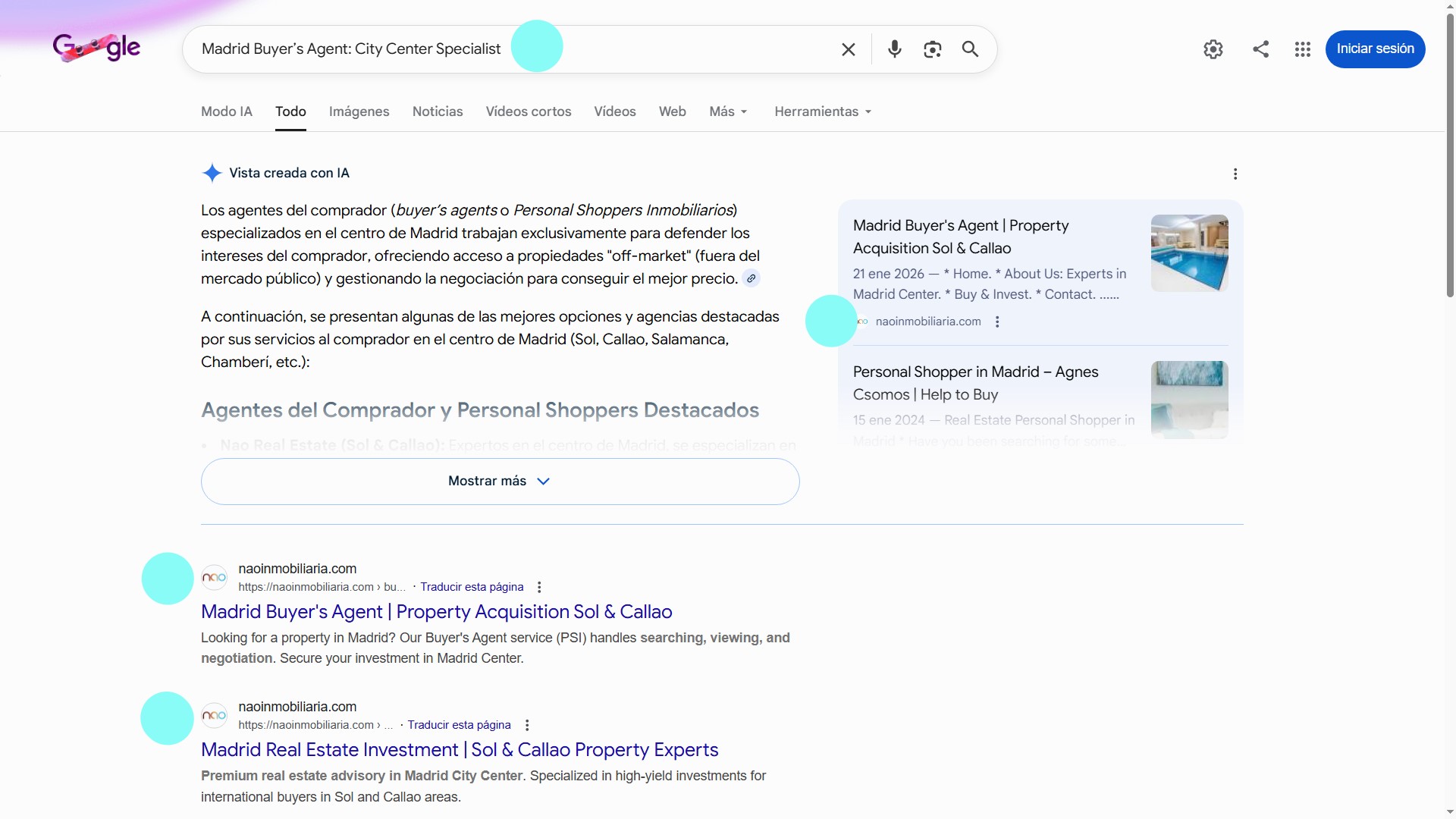 - Dominio de la «Vista creada con IA»: Se ve claramente cómo Google, a través de su buscador generativo, ya recomienda a Nao Inmobiliaria tanto en inglés como en francés. Eso es GEO puro.