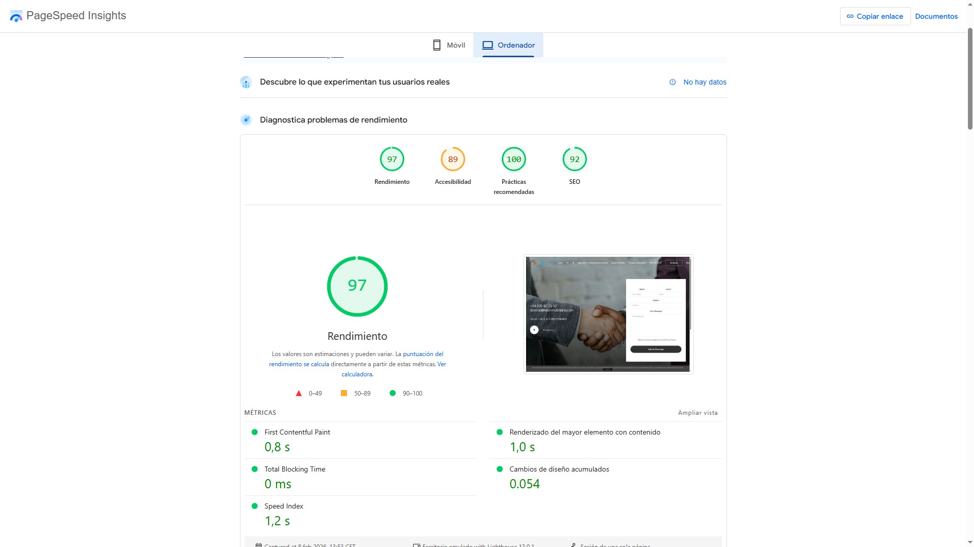 A nivel de experiencia de usuario, el resultado es sencillamente espectacular. No es solo que haya quedado «chula» o elegante a la vista; es que es una herramienta de precisión. Si pasas la web por Google PageSpeed, los resultados te dan la razón: vuela. Hemos logrado que una plataforma con una carga visual tan potente cargue en milisegundos. En un mercado donde el inversor de lujo no espera ni tres segundos, esa velocidad es la diferencia entre captar un lead o regalarlo a la competencia.